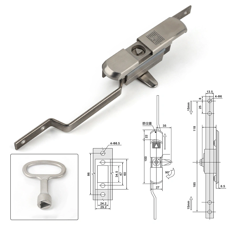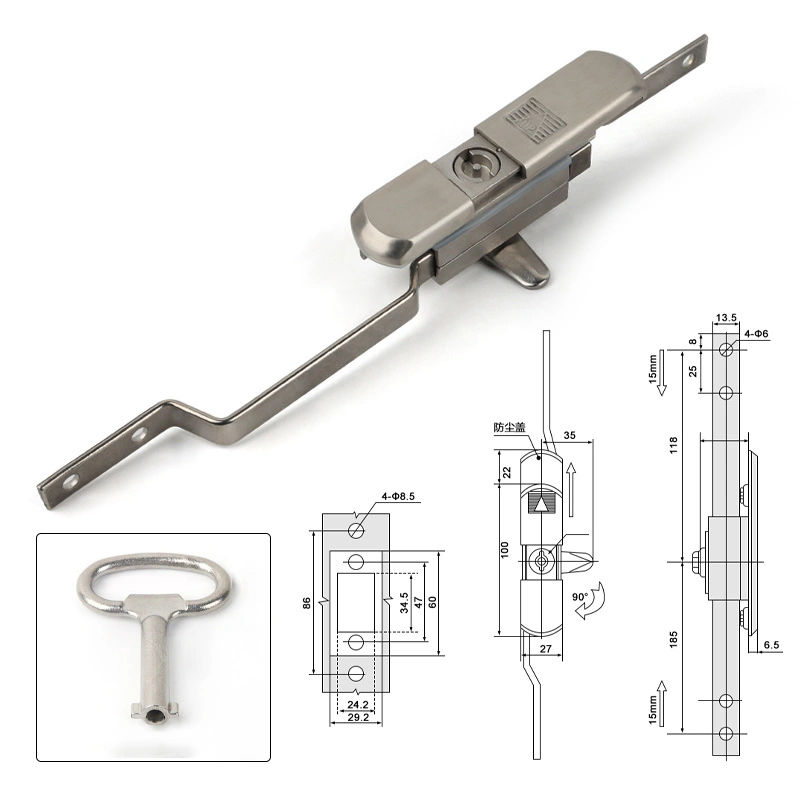 De functie van dit slot is om kastdeuren te beveiligen via een verticaal staafmechanisme, waardoor uitgebreide bescherming wordt geboden voor elektrische kasten of serverrekken. Het productontwerp is compatibel met Rittal -kasten en standaard kastlichamen, en de installatie heeft geen invloed op de deurstructuur. De slotlichaam heeft een stofomslag voor vereenvoudigd onderhoud.