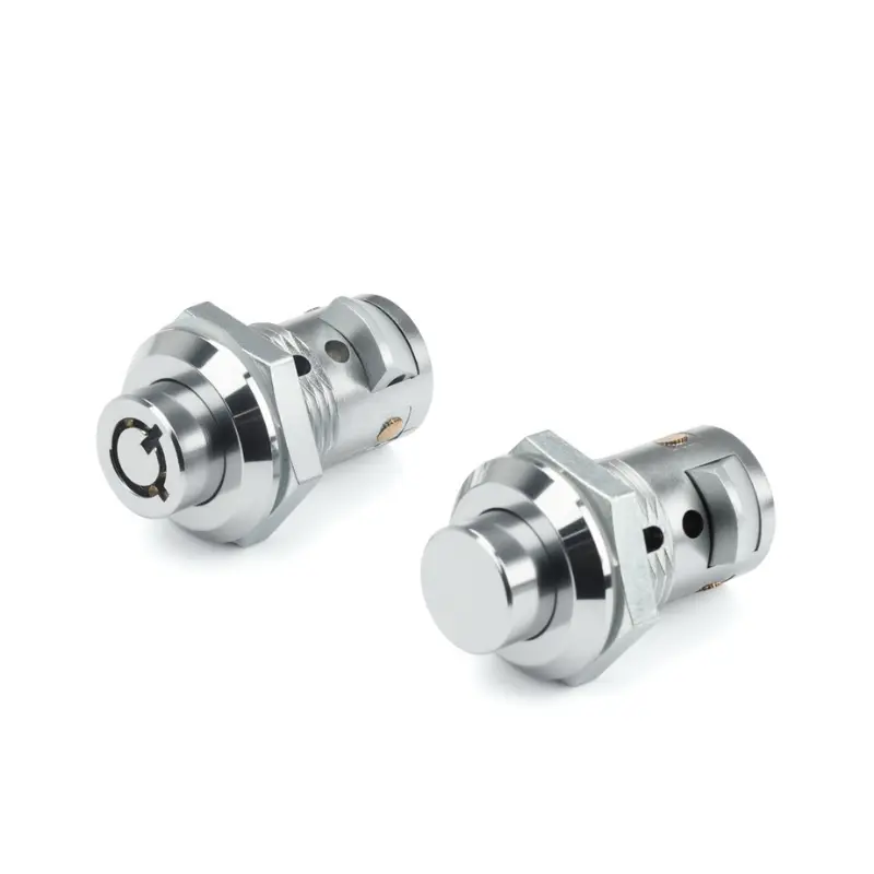Het model met drukknop ontgrendelt automatisch wanneer de knop wordt ingedrukt en wordt vergrendeld wanneer de deur gesloten is, wat een basisbeveiliging biedt. Het model met pin-tuimelaarslot maakt gebruik van een pinmechanisme dat alleen rotatie mogelijk maakt met een bijpassende sleutel, wat antidiefstalfunctionaliteit biedt. Beide modellen maken gebruik van een constructie van zinklegering om een bepaald niveau van sterkte te bieden, en zijn voorzien van toegevoegde waterdichte pakkingen voor extra gebruiksgemak. Het cilinderslot van zinklegering van de verkoopautomaat heeft een glanzende chroomafwerking voor corrosiebestendigheid. De maximale dikte van geïnstalleerde deurpanelen is 10 mm. (Voor roestvrijstalen materialen kunt u contact met ons opnemen. We zijn momenteel bezig met de productie van de mallen.)